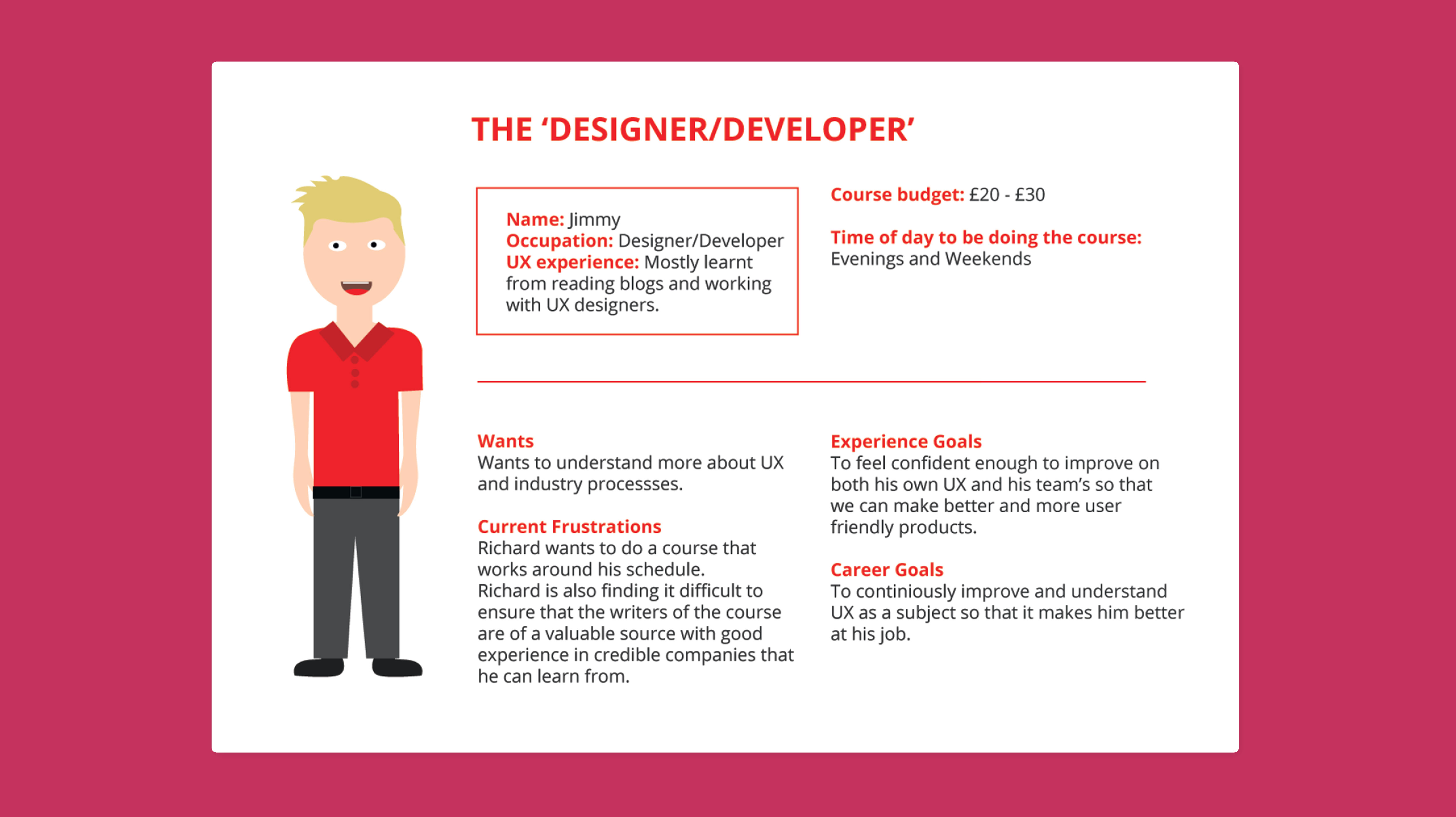 I then drew personas up to give myself a clear understanding of the variety of users that would be interacting with the site and the types of needs my users had which I discovered during my research.